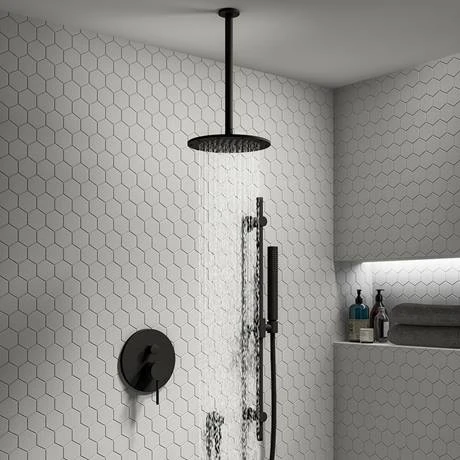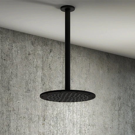 The Arezzo 195mm round matt black ceiling mounted shower head with long arm, it’s chic minimalist design will bring a touch of sophistication to any bathroom. Our range of Shower heads are ideal for renewing the style of your bathroom affordably.