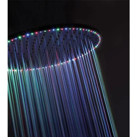 Rio Spectrum is a brand new ultra thin showerhead that provides a spectrum of stunning colour effects with 96 LED lights, programmed by a keypad with 13 individual lighting settings. The low consumption LED lamps create a column of water and light with a diameter of 400mm that operates perfectly with 3-bar pressure. Manufactured from solid brass this stunning overhead shower is guaranteed for 10 years.