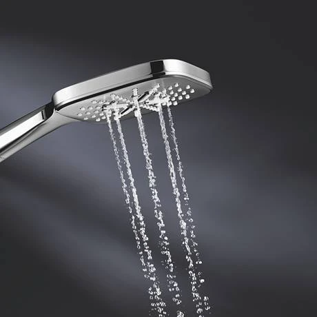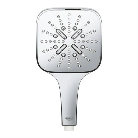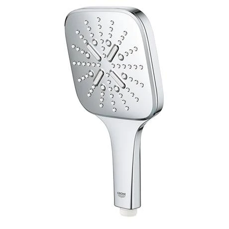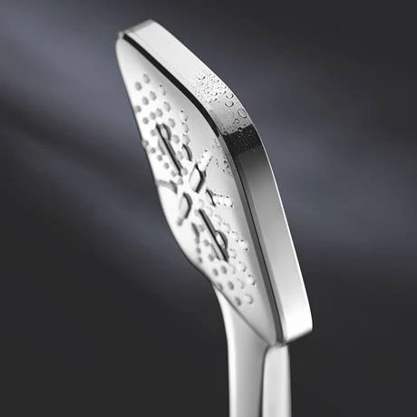 The GROHE Rainshower 130 SmartActive Cube hand shower is packed with innovative technology and is a joy to use. GROHE SmartTip β an ergonomic controller on the rear of the handle β gives you fingertip control of the spray pattern: pulsating GROHE ActiveMassage spray, which delivers a whole new level of revitalising massage power, invigorating Jet Spray and Rain Spray β as gentle as summer rain. When you turn the water off GROHE DripStop minimizes annoying drips from Rain and Jet spray. And thanks to GROHE DreamSpray, with every pattern the flow from every nozzle has a perfectly balanced flow for maximum satisfaction, and the SpeedClean anti-lime nozzles are extra easy to clean too. It also has GROHE EcoJoy, which limits water flow to 9.5 l/min but also delivers pure indulgence, and with a durable GROHE StarLight chrome finish it will sparkle for years. Plus the Inner WaterGuide prevents the surface from getting too hot, protecting both your skin and the chrome finish.