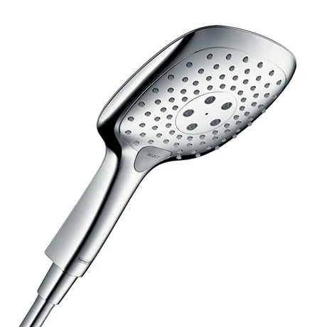 Stylish and easy on water consumption, the Raindance Select E 150 EcoSmart Hand Shower features three different spray types: The RainAir soft shower spray produces soft beads of water that are enriched with air. The CaresseAir massage spray leaves you feeling invigorated thanks to the impact of 5 intensive individual sprays. The Mix full shower function completes the range of spa features, with a combination of both spray types.