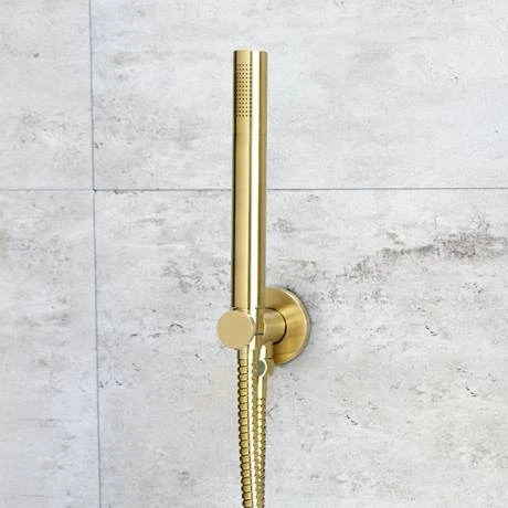 For use with concealed shower valves, this stylish Vos Brushed Brass shower kit is suitable for water systems with a minimum pressure of 0.2 bar and comprises of an outlet elbow with integrated wall outlet, shower hose and a pencil style single function handset.