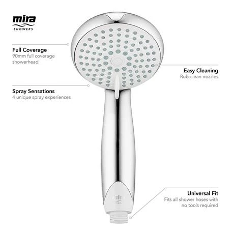 The Mira Nectar Eco Four Spray Showerhead allows you to save up to 85% more water thanks to its integrated flow regulator. It also features rub-clean nozzles on the spray face, for easy cleaning and limescale removal. Compatible with all shower hoses and easy to fit.