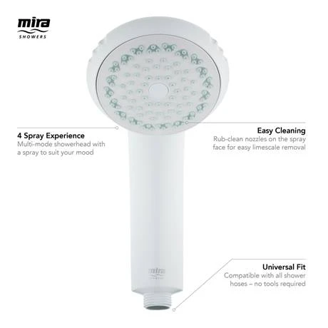 Mira’s most popular shower head, the Response Four Spray Showerhead in White is the perfect upgrade for your existing showerhead. It features rub-clean nozzles on the spray face, for easy cleaning and limescale removal. Compatible with all shower hoses and easy to fit. Works with any shower on any system.
